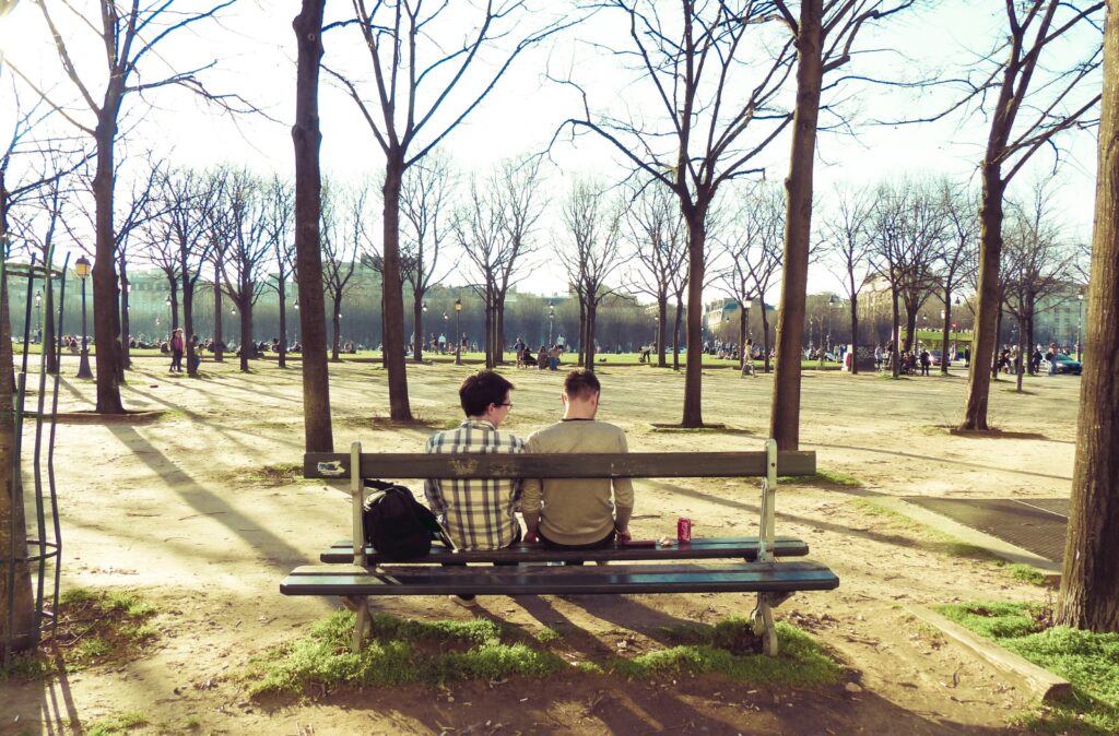 Two figures sit on a park bench in the pale afternoon, backs turned to the camera, shoulders nearly touching. Around them, winter trees cast long shadows. The city is present but distant. Nothing spectacular happens — and yet everything happens. They share a horizon. They choose to remain.