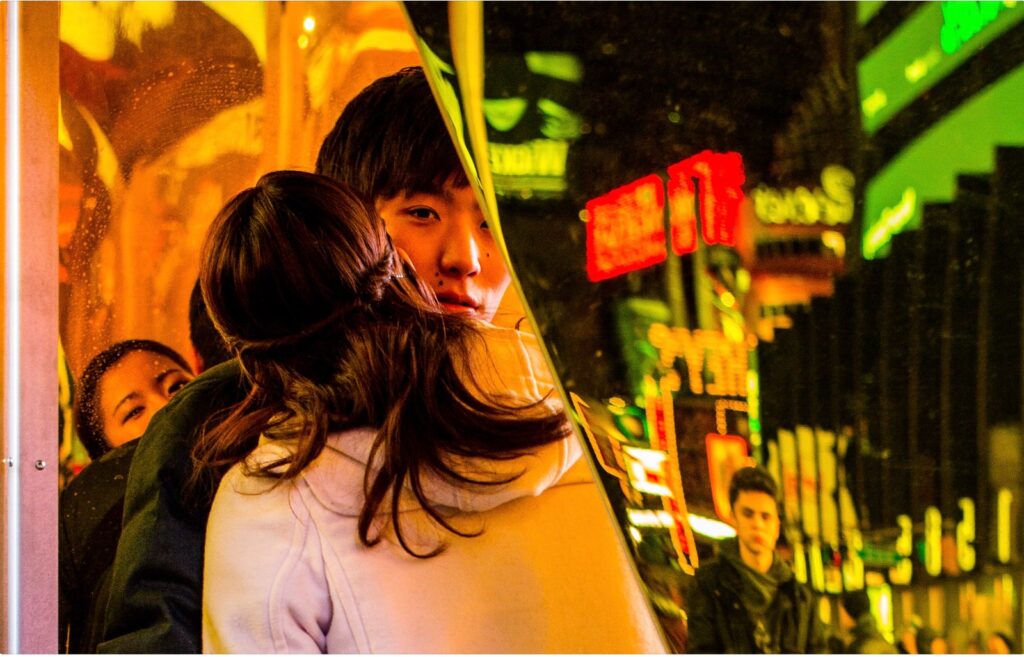 In another frame, a couple folds into each other under neon reflections. The city multiplies their embrace in glass and color. Love here is almost defiant — a body insisting on contact in a world of spectacle. It does not ask permission. It does not apologize for its intensity.