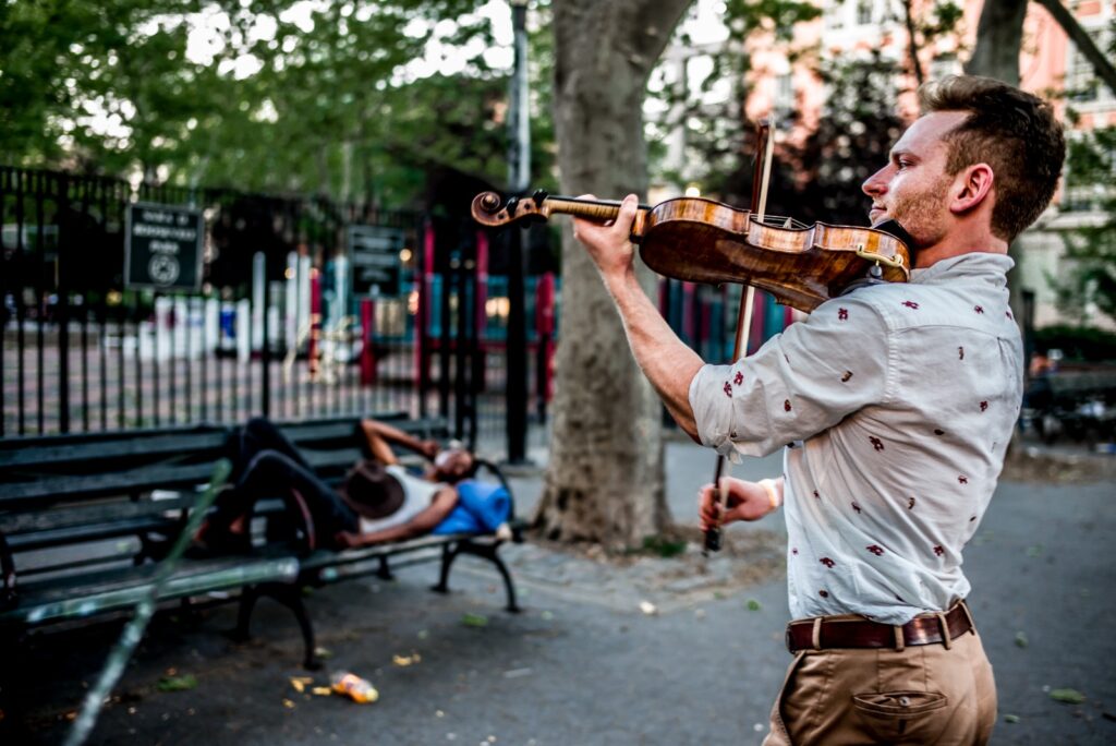 And in the park edged by iron fences and trees, a violinist plays with fierce concentration. His body leans into the instrument, bow cutting the air with urgency. A few steps away, someone lies stretched across a bench, drifting between sleep and wakefulness. The musician does not stop. He plays as if the sound itself were an act of defiance.